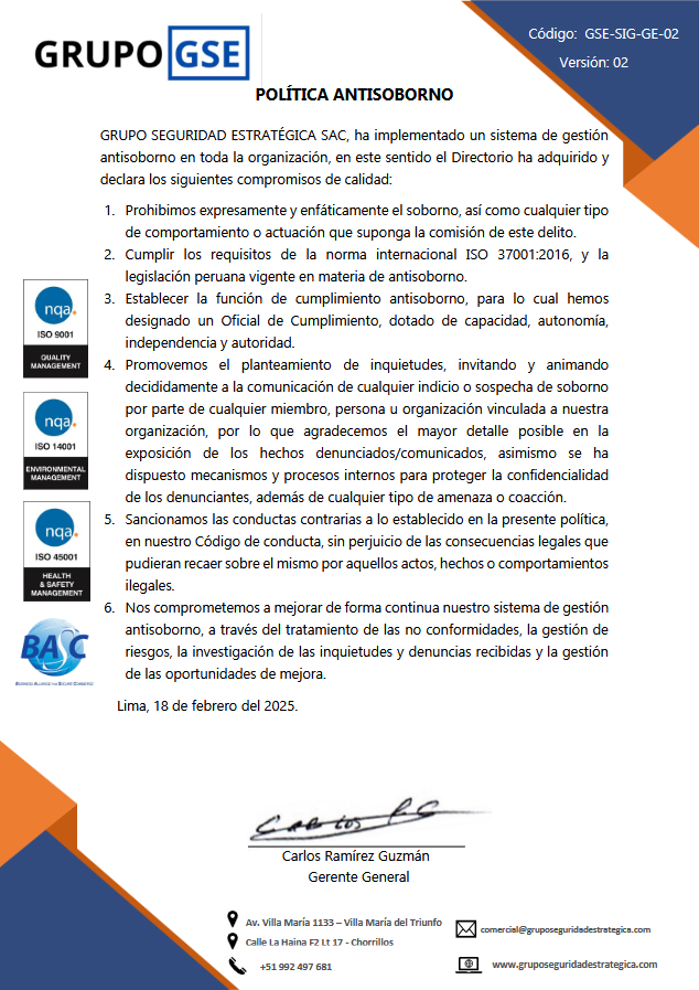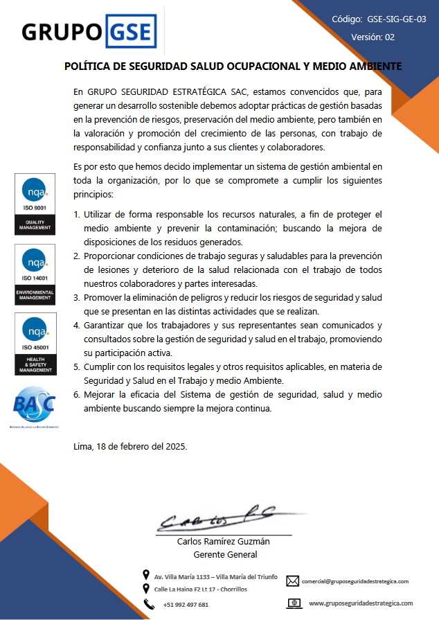 Ser líderes en ofrecer servicios de seguridad especializados que integren el respeto al medio ambiente, la protección de la salud y seguridad de los trabajadores, el uso de tecnologías avanzadas y el cumplimiento de políticas antisoborno. Nuestro objetivo es garantizar un servicio de calidad que no solo beneficie a nuestros clientes, sino que también contribuya positivamente a la sociedad.